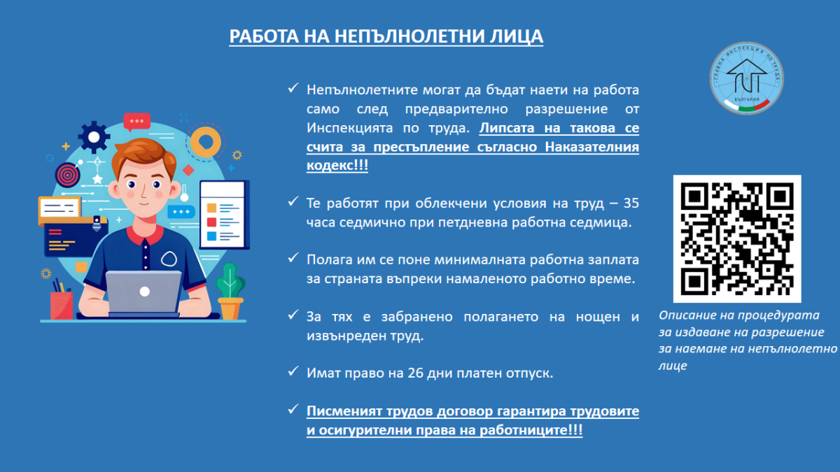 Наемането на непълнолетни лица без разрешение от Инспекцията по труда се счита за престъпление, което се преследва според разпоредбите на Наказателния кодекс.