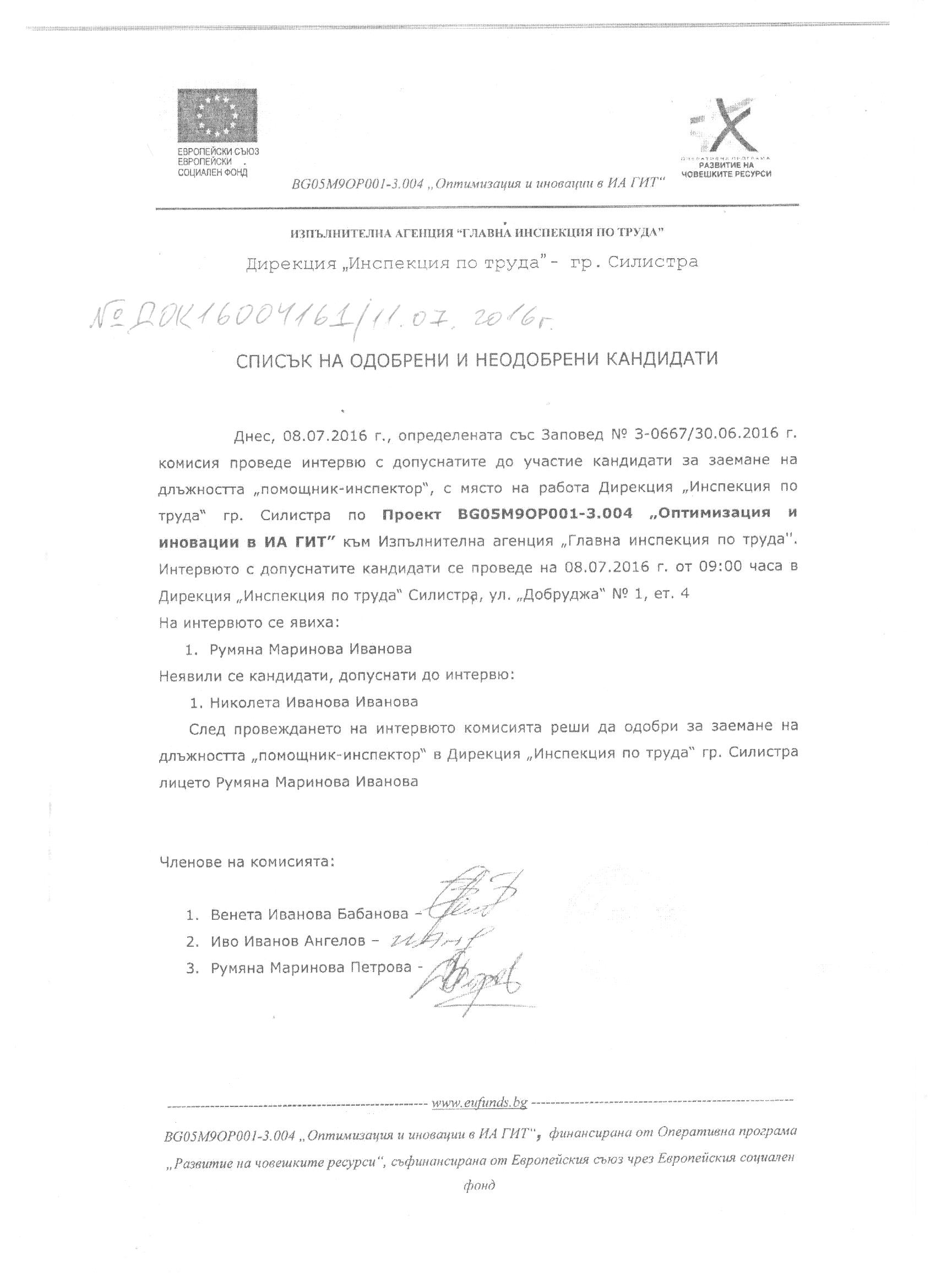 Списък на одобрените и неодобрените кандидати за длъжността помощник-инспектор в дирекция “Инспекция по труда“ със седалище Силистра Дата на публикуване 12.07.2016 г. Прикачен файл Списък на одобрените и неодобрените кандидати за длъжността помощник-инспектор …