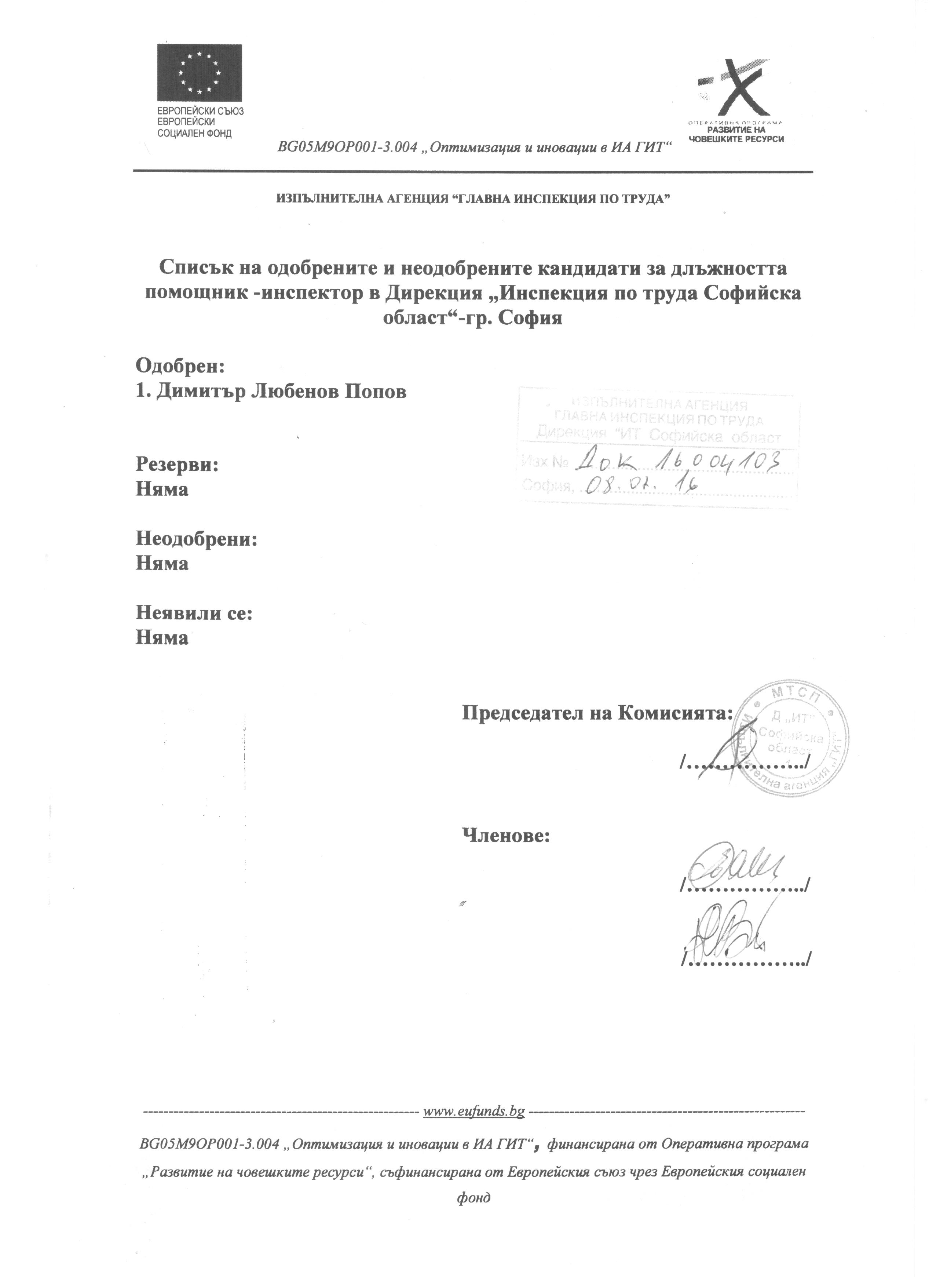 Списък на одобрените и неодобрените кандидати за длъжността помощник-инспектор в дирекция “Инспекция по труда“ със седалище София Дата на публикуване 12.07.2016 г. Прикачен файл Списък на одобрените и неодобрените кандидати за длъжността помощник-инспектор …