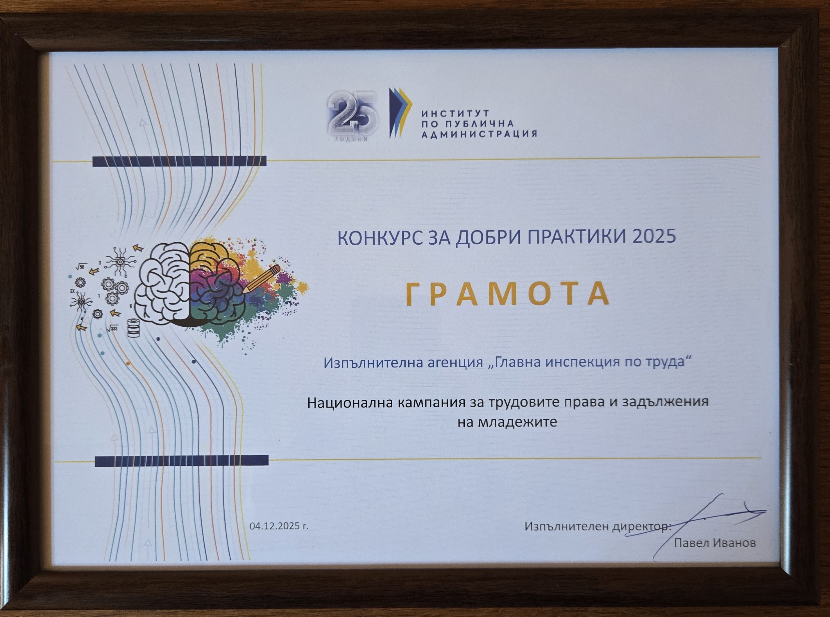 ИА „Главна инспекция по труда“ (ИА ГИТ) получи грамота от Института по публична администрация (ИПА) за проведената през 2024 г. национална кампания за трудовите права и задължения на младежите. Грамотата получи главният секретар на Агенцията инж. Георги Милчин по време на връчването на наградите в конкурса „Добри практики 2025“.